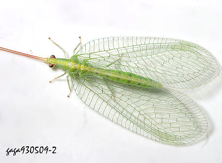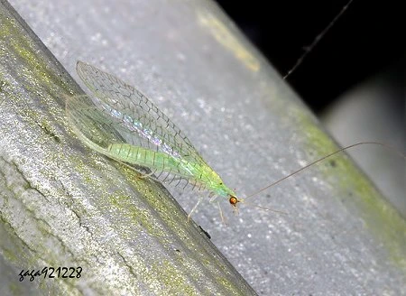 有關 (天敵昆蟲) 螳螂/草蛉/椿象 批發請洽: 螳螂館 03-8731316 / 0958968239 草蛉 (草蛉科) 體長18-20mm, 體型線形細長,複眼具紅色金屬光澤,體背綠色中央具淡黃色的縱紋,頭部小,觸角基節鮮黃色,鞭節線形,橙紅色,節間具黃褐色環紋,翅膀寬狹透明,翅脈綠色無斑,腹部側緣各節間具褐斑,近末節斑點漸小。本種普遍分布全島 低中海拔山區,幼蟲俗稱蚜獅,以蚜蟲、粉蝨、介殼蟲類為食,身體會背偽障物防止天敵奪食,成蟲一般具趨光性。